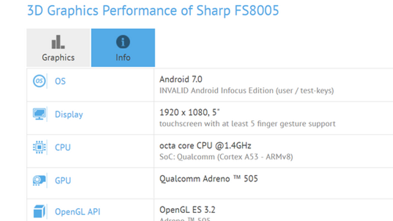 База данных ПО GFXBench поведала подробности о новом смартфоне компании Sharp. Устройство фигурирует под каталожным номером FS8005, так что пока неизвестно, что же это за модель.