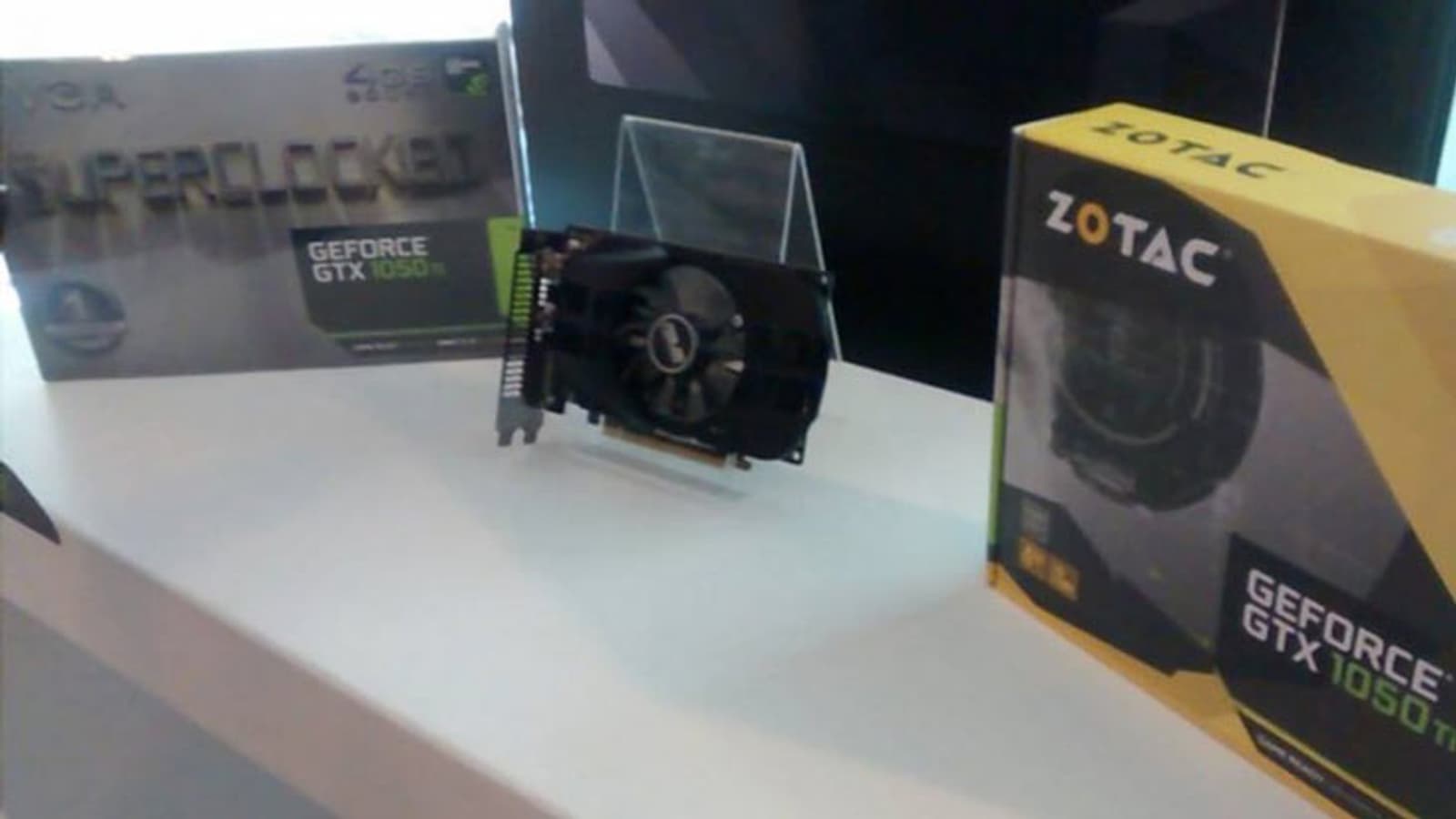 По бокам от 3D-карты Asus GeForce GTX 1050 Ti Mini видны коробки 3D-карт GeForce GTX 1050 Ti производства EVGA и Zotac. Судя по первой из них, EVGA готовит к выпуску разогнанную модель серии SuperClocked, оснащенную 4 ГБ памяти.