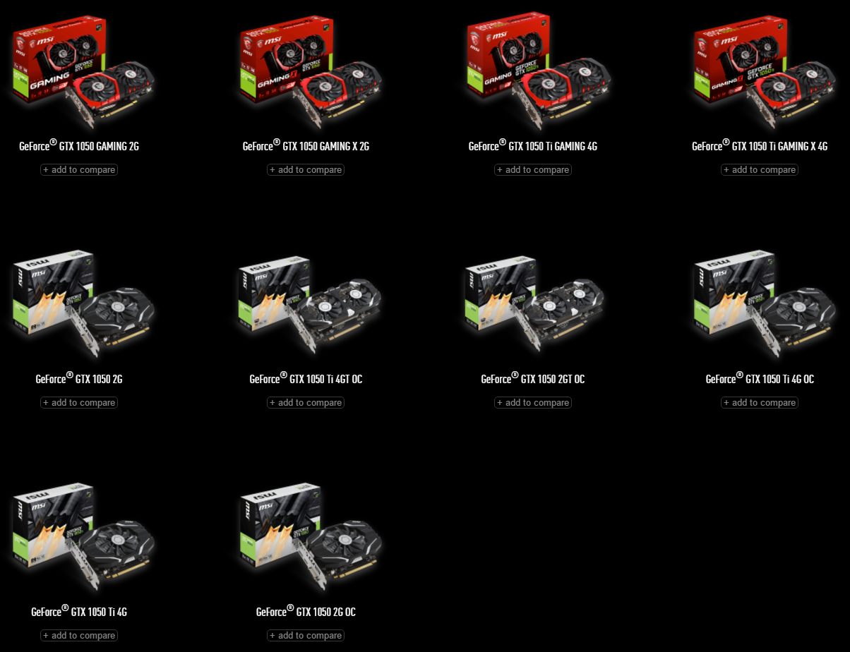 Так как карт много, а их системы охлаждения ничего нового из себя не представляют, этому нюансу отдельного внимания уделять не будем. Отметим лишь, что каждая из карт (GTX 1050 и GTX 1050 Ti) получила у MSI по пять различных вариантов исполнения. Идентичные варианты старшей и младшей карт между собой не отличаются, не считая отличий, заложенных параметрами каждой из моделей.
