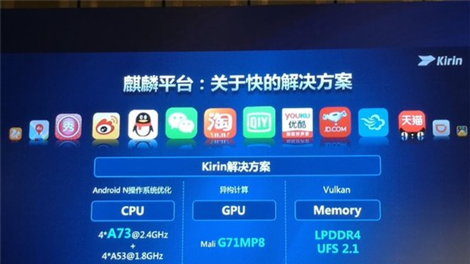 SoC Kirin 960, которая производится с использованием 16-нанометрового технологического процесса, включает четыре новых производительных ядра Cortex-A73 (до 2,4 ГГц) и четыре энергоэффективных Cortex-A53 (до 1,8 ГГц). Это первая однокристальная система, в которой применен GPU Mali-G71 MP8. По производительности GPU новая SoC опережает Snapdragon 820 и вдвое превосходит Kirin 950. Хотя лидер в лице Apple A10 пока остается на своем месте.