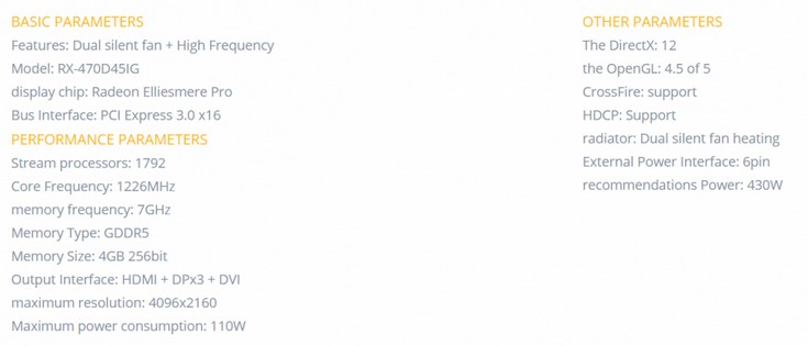 Второй источник называет карту Radeon RX 470 SE и утверждает, что она содержит 1536 потоковых процессоров, 96 текстурных блоков, 24 блока растровых операций и характеризуется TDP 90 Вт.