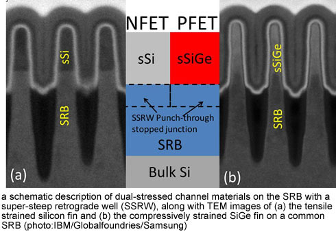 Компании IBM, Globalfoundries и Samsung сделали ставку на литографию с использованием жесткого ультрафиолетового излучения (EUV). Использование EUV означает переход к источнику излучения с гораздо меньшей длиной волны по сравнению с используемыми сейчас (13,5 нм против 193 нм). Кроме того, в этом техпроцессе используется напряженный кремний и соединение кремния и германия. Это упрощает формирование очень тонких структур, но сложности, с которыми столкнулись партнеры при разработке техпроцесса, позволяют предположить, что TSMC раньше приступит к коммерческому выпуску продукции по нормам 7 нм.
