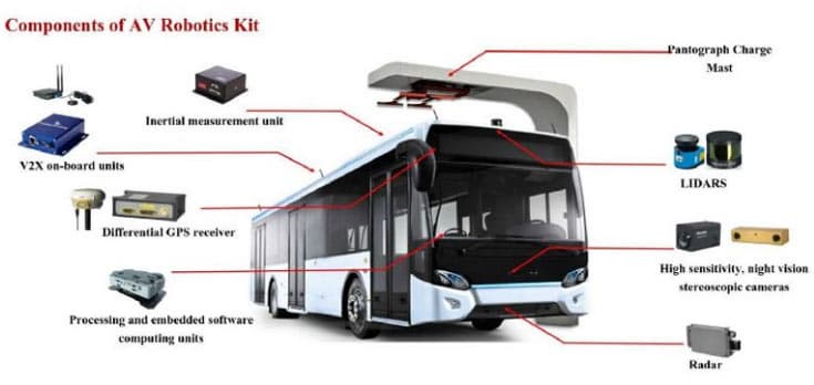 Электробусы будут заряжаться в депо, пополняя заряд на остановках. Для этого предполагается использовать подключение с помощью пантографа, как у трамвая или электропоезда. Система автономного вождения включает приемник GPS, инерциальные датчики, лидары, радар, высокочувствительную стереоскопическую камеру и компьютер для обработки данных.