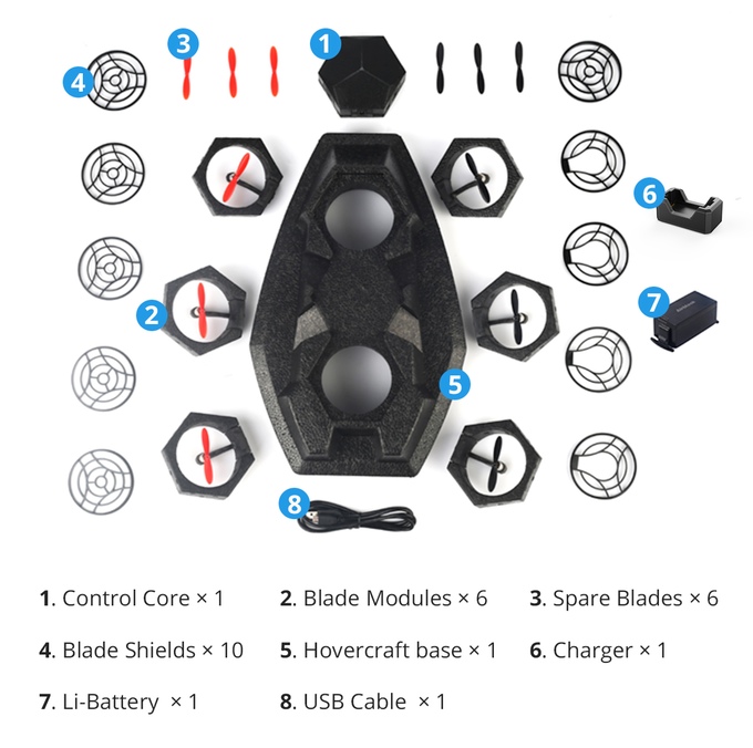 В комплект также входит еще один основной модуль, при использовании которого вы получаете миниатюрное судно на воздушной подушке. Он может двигаться с большой скоростью над твердой поверхностью и над водой благодаря воздушной подушке, которая образуетcя нагнетаемым под днище воздухом.