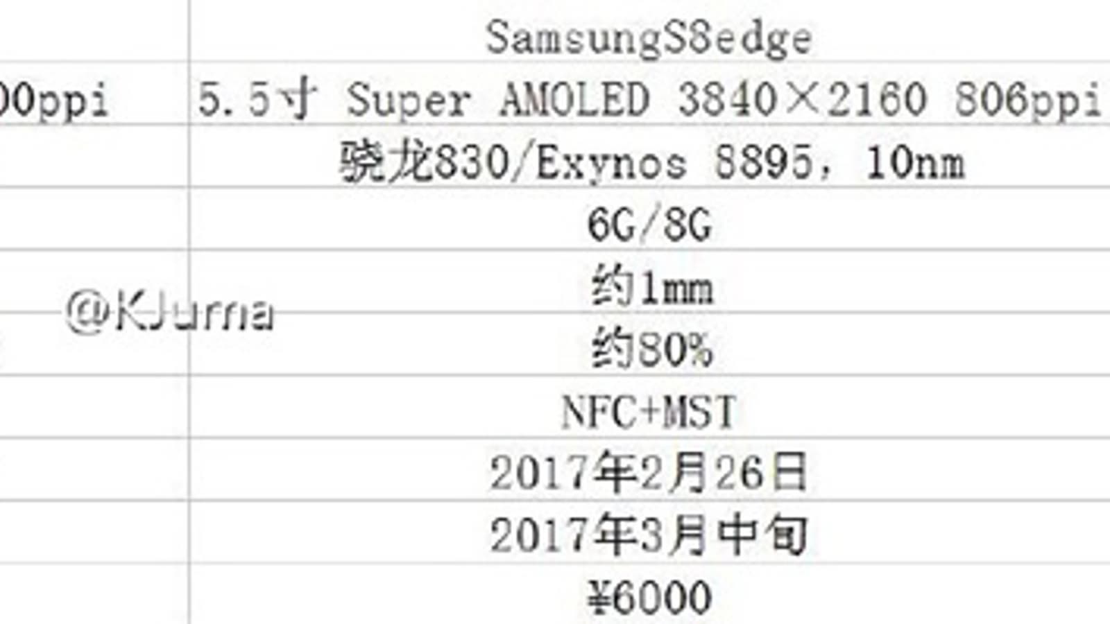 По данным источника, официальная премьера Samsung Galaxy S8 edge состоится 26 февраля 2017 года, а в продажу смартфон поступит уже в марте. Ожидается, что стоимость новинки составит $890.
