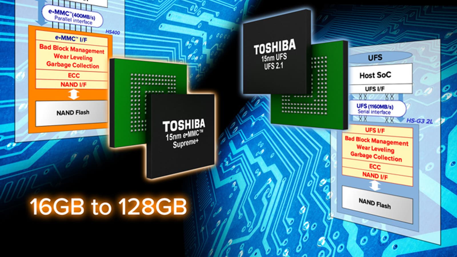 Новые модули e-MMC выпускаются объемом от 16 до 128 ГБ. В режиме чтения они развивают скорость до 320 МБ/с, в режиме записи — 180 МБ/с. Теоретический предел скорости параллельного интерфейса e-MMC равен 400 МБ/с. В модулях UFS используется интерфейс MIPI M-PHY, теоретически, позволяющий передавать данные со скоростью до 1166 МБ/с (две линии MIPI M-PHY HS-G3). В случае новых модулей Toshiba, выпускаемых объемом от 32 до 128 ГБ, скорость чтения достигает 850 МБ/с, скорость записи — 180 МБ/с.