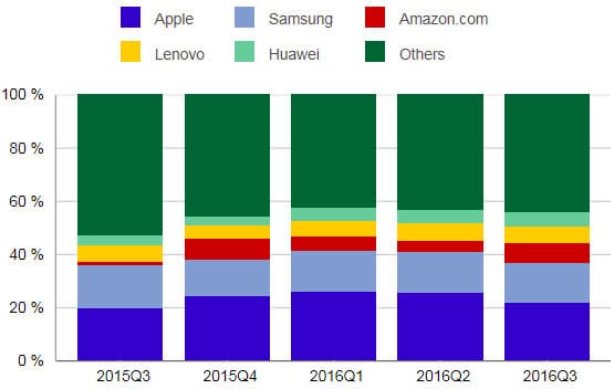 Занимающая третье место компания Amazon совершила рывок: ее доля за год выросла с 1,5% до 7,3%. Для этого крупнейшему онлайновому магазину пришлось увеличить поставки с 0,8 до 3,1 млн штук.