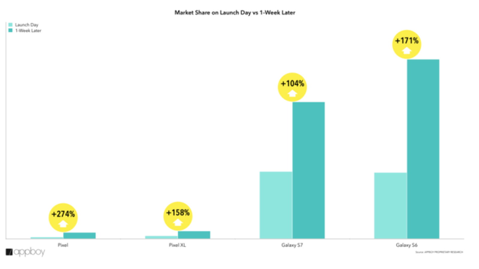 Но вот модель Nexus 6P на старте продаж вполне была сопоставима с аппаратами Pixel. Поэтому сравнивать продажи новинок именно с этим смартфоном, наверное, наиболее корректно. Это и попытались сделать специалисты Appboy.