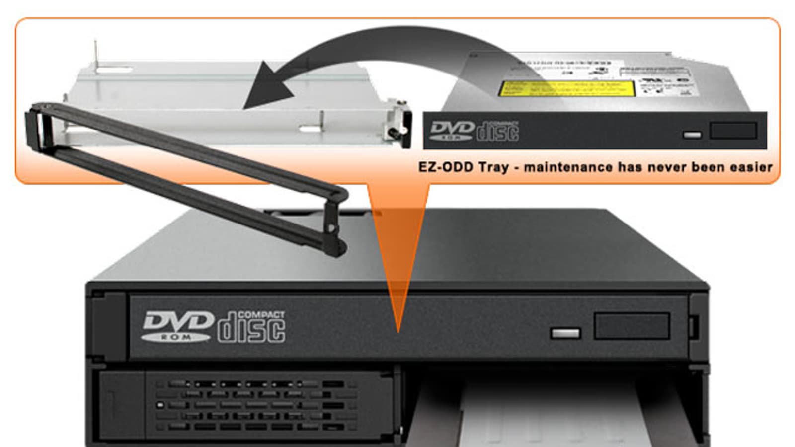 Интересной особенностью Icy Dock MB994IPO-3SB является монтаж оптического накопителя в съемный металлический лоток EZ-ODD Tray, фиксируемый защелкой. Лоток совместим с приводами высотой 12,5 мм. Накопители типоразмера 2,5 дюйма тоже загружаются в лотки (EZ Slide Mini Tray). Это облегчает их замену. Лотки, изготовленные из металла, совместимы с накопителями толщиной 7, 9,5, 12,5 и 15 мм.