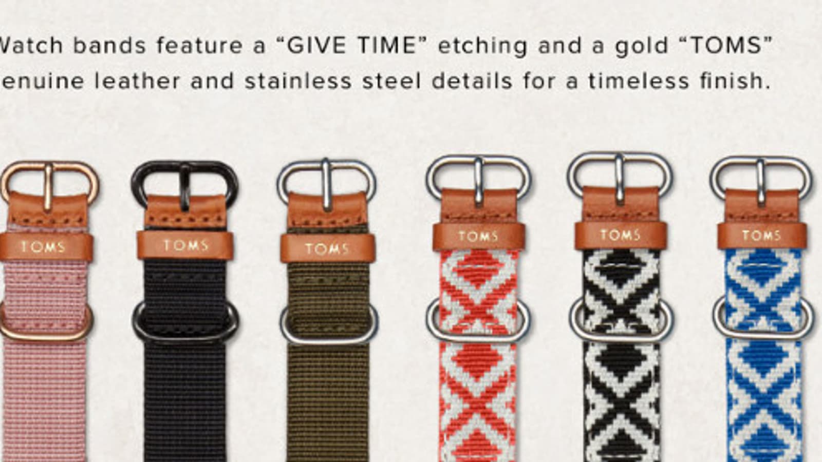 Список ремешков для Apple Watch пополнила компания Toms, специализирующаяся на создании одежды и обуви. А ещё эта компания известна своей благотворительностью. Toms представила два вида ремешков: тканевые Utility Collection за $50 и кожанные Artisan Collection за $75. Естественно, присутствует большой выбор в каждом из видов. Но интересны не только ремешки, а и благотворительная кампания, связанная с ними.