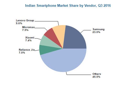 Лидером данного рынка по суммарным продажам стала Samsung Electronics, которая продемонстрировала улучшение показателей на 8 и 9,7% по сравнению со вторым кварталом 2016 и третьим кварталом 2015 соответственно. Samsung занимает 23% рынка смартфонов Индии, на втором месте оказалась Lenovo с 9,6%, которая за квартал смогла нарастить объемы поставок более чем на 46%.