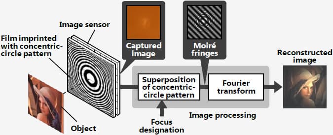 Суть технологии заключается в использовании муарового эффекта, который достигается за счёт суперпозиции концентрических окружностей. Hitachi предлагает лишить камеру объектива, заменив его специальной плёнкой с узором из концентрических окружностей, которая будет наноситься на датчик изображения. Что же касается фокусировки, такая технология позволит выбирать фокус уже после получения снимка, как в случае с камерами светового поля.