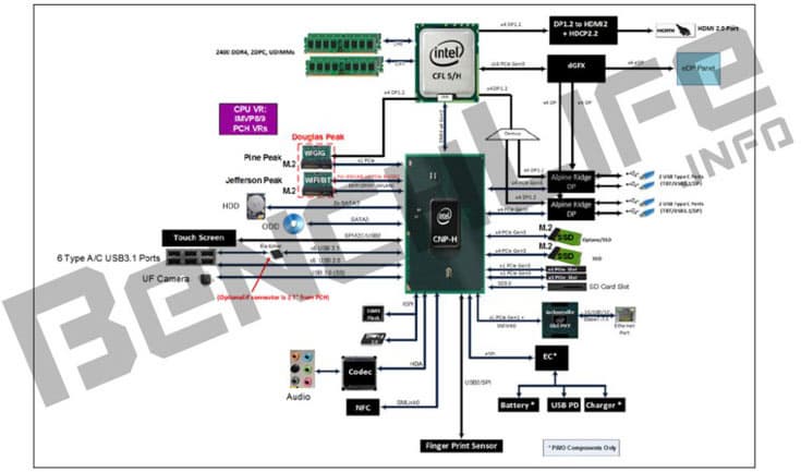 Конфигурация Cannonlake PCH включает два контроллера Alpine Ridge, так что системная плата на таком чиспсете сможет иметь до четырех универсальных портов USB-C (Thunderbolt / USB 3.1 / DisplayPort). Точное количество линий PCIe пока неизвестно, но их будет довольно много. Часть линий PCIe выделена для твердотельных накопителей, устанавливаемых в два слота M.2. Слоты расширения PCIe 3.0 x4 и 3.0 x1 также будут обеспечены за счет ресурсов PCH. Кроме того, можно отметить наличие шести портов USB 3.1, трех портов SATA 6 Гбит/с, порта Gigabit Ethernet, звукового кодека, а также поддержку слота SD, дактилоскопического датчика, NFC, сенсорного экрана и контроллера беспроводных соединений (WiGig, Wi-Fi и Bluetooth).