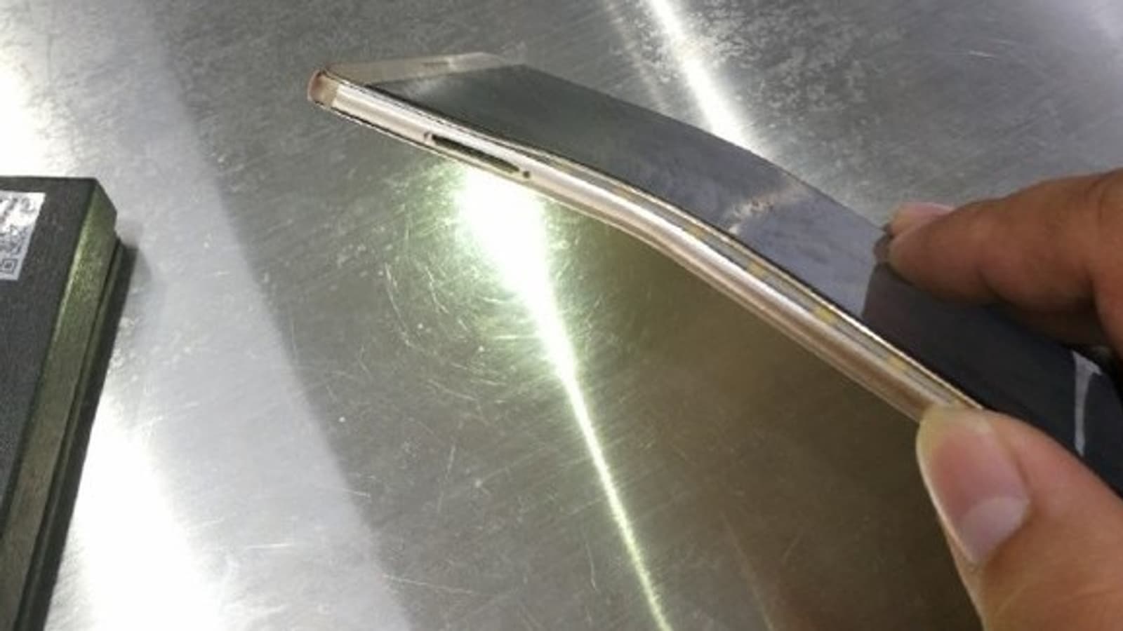 Пользователь, опубликовавший фотографии, утверждает, что смартфон каким-то образом оказался зажатым в дверной коробке, в результате чего его металлический корпус заметно деформировался.