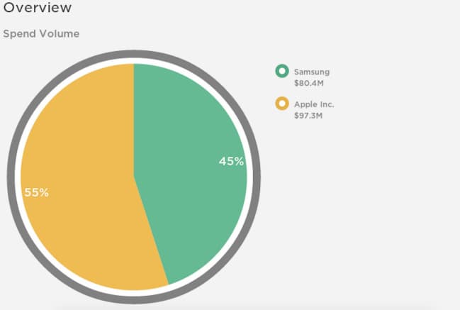 За период с 30 ноября 2015 года по 30 ноября 2016 года Apple потратила на рекламу по цифровым каналам в США 97 млн долларов, Samsung — 80,4 млн долларов. Если же исключить рекламу товаров Samsung, которые не имеют прямых конкурентов в ассортименте Apple, например, холодильников, стиральных машин или твердотельных накопителей, окажется, что Apple тратит на 179% больше, чем Samsung.