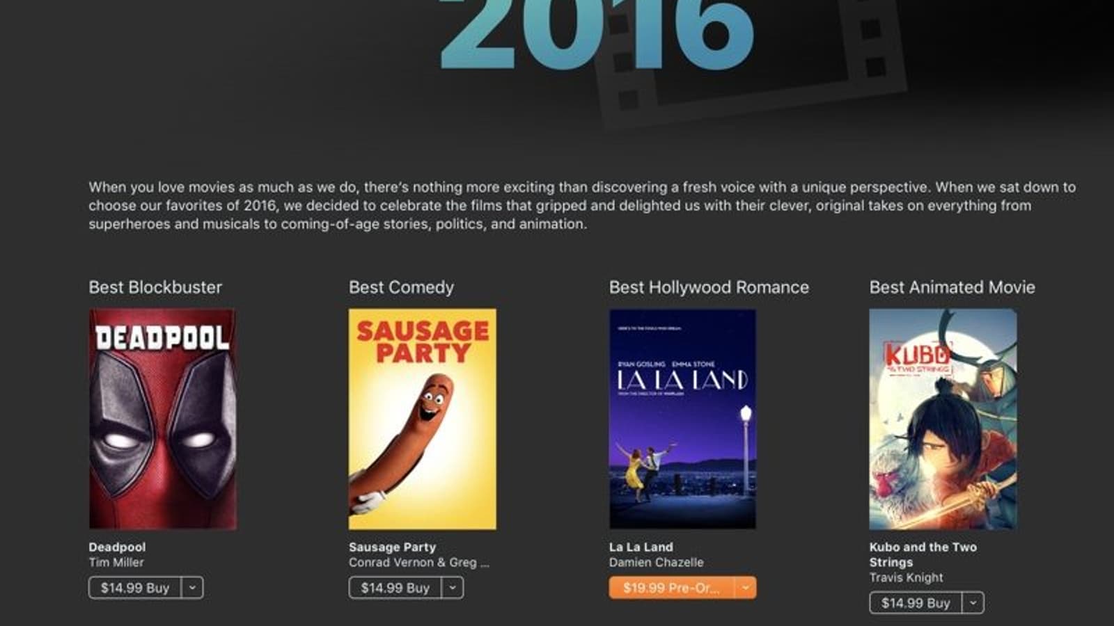 Если же говорить о самых продаваемых фильмах, то таковыми были Star Wars: The Force Awakens, Deadpool, Zootopia, The Martian, Captain America: Civil War, Spotlight, The Hateful Eight, Room, Brooklyn и Eye in the Sky.