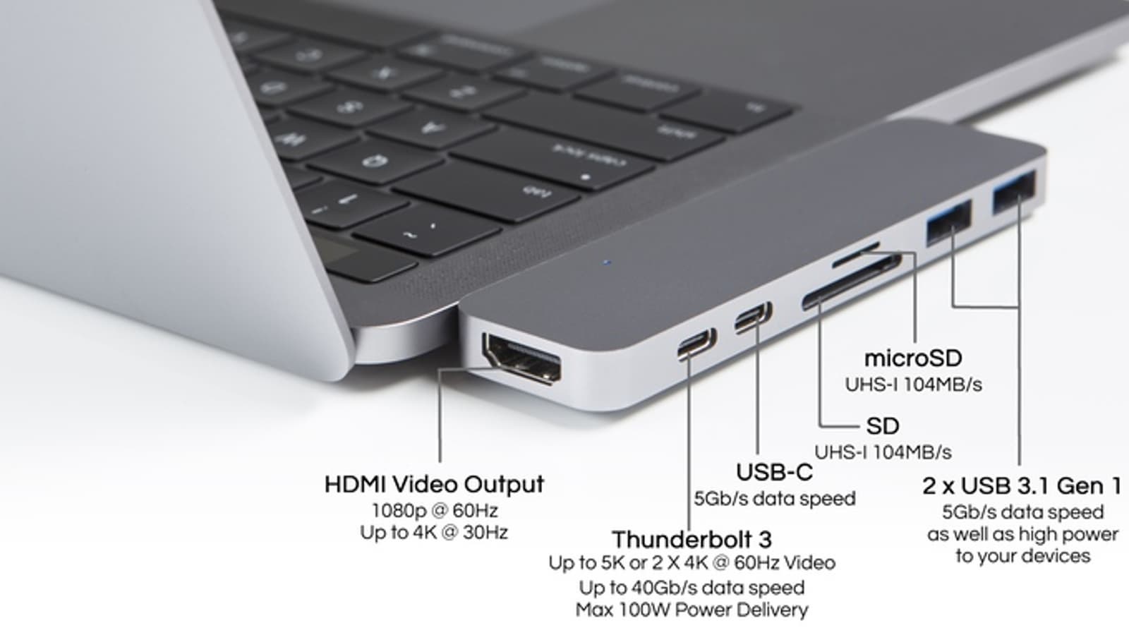 HyperDrive представляет собой адаптер, подключаемый к порту USB-C. Точнее, к сразу двум портам на одной стороне ноутбука. Взамен он предоставляет пользователю разъёмы HDMI, USB-C, USB-C с поддержкой Thunderbolt 3, USB 3.1 (x2), а также слоты для карт SD и microSD. По сути, покупатель HyperDrive теряет лишь в габаритах, а вот в наборе портов только приобретает. Более того, один из портов USB-C поддерживает спецификации Power Delivery, то есть позволяет заряжать ноутбук.