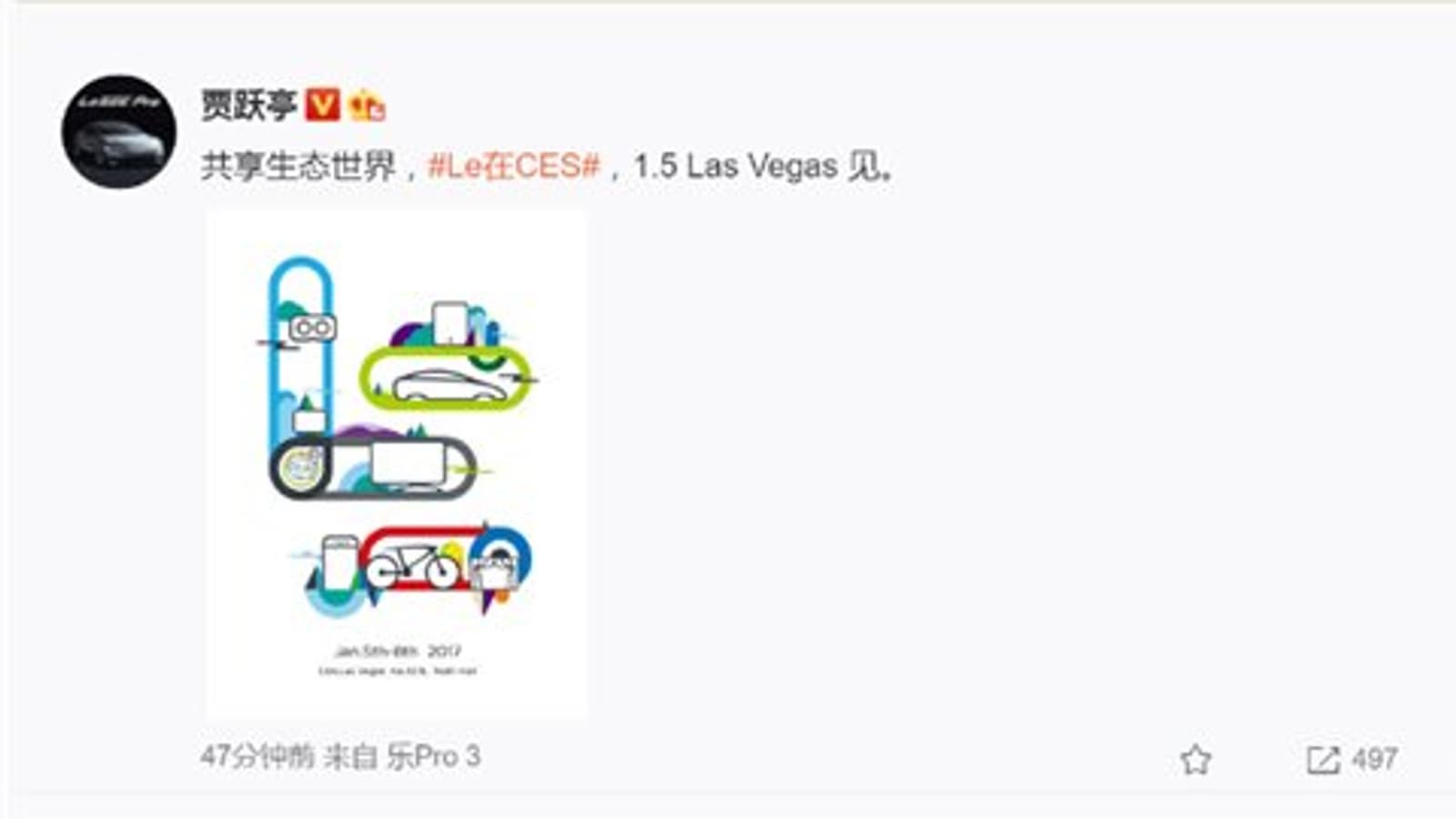 Данную информацию опубликовал на своей страничке в социальной сети Weibo глава компании LeEco Цзя Юэтин (Jia Yueting). На сопроводительном изображении было указано, что выступление компании в рамках CES 2017 состоится 5 января.