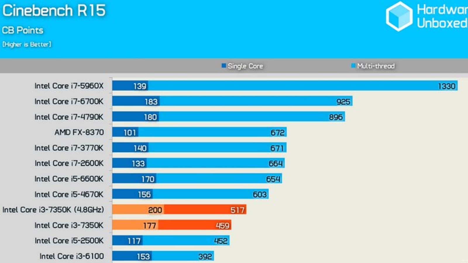 К сожалению, набор тестовых приложений и конкуренты подобраны не идеально. В частности, отсутствуют младшие модели Core i5 пока ещё актуального поколения. Учитывая, что CPU Core i5 поколения Kaby Lake от предшественников далеко не уйдут, было бы интересно сравнить Core i3-7350K с Core i5-6400, так как их стоимость будет примерно одинаковой. При этом первый работает на гораздо более высокой частоте, но располагает лишь двумя ядрами.