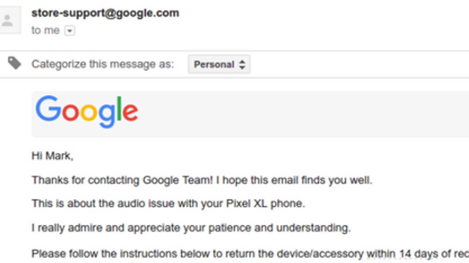 Однако затем Марк Бакман получил письмо из службы технической поддержки Google, в котором владельцу предложили просто вернуть смартфон в магазин и получить назад свои деньги. Google даже не предложила человеку новый смартфон Google Pixel, потому как, похоже, компания не уверена, что в нем не проявится та же самая проблема. Другими словами, ему предлагают купить смартфон другого производителя.