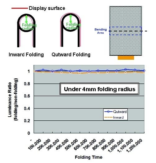 Чтобы получить такой результат, специалисты AUO внесли изменения в структуру панели, постаравшись сделать ее более симметричной относительно среднего слоя, в котором сформированы тонкопленочные транзисторы, наиболее чувствительные к деформации. Новая панель выдерживает более 1,2 млн циклов сгибания-разгибания с радиусом кривизны 4 мм.