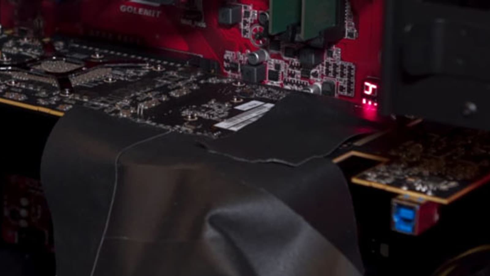 Это инженерный образец карты на новом GPU. Он оснащен дополнительными отладочными разъемами.