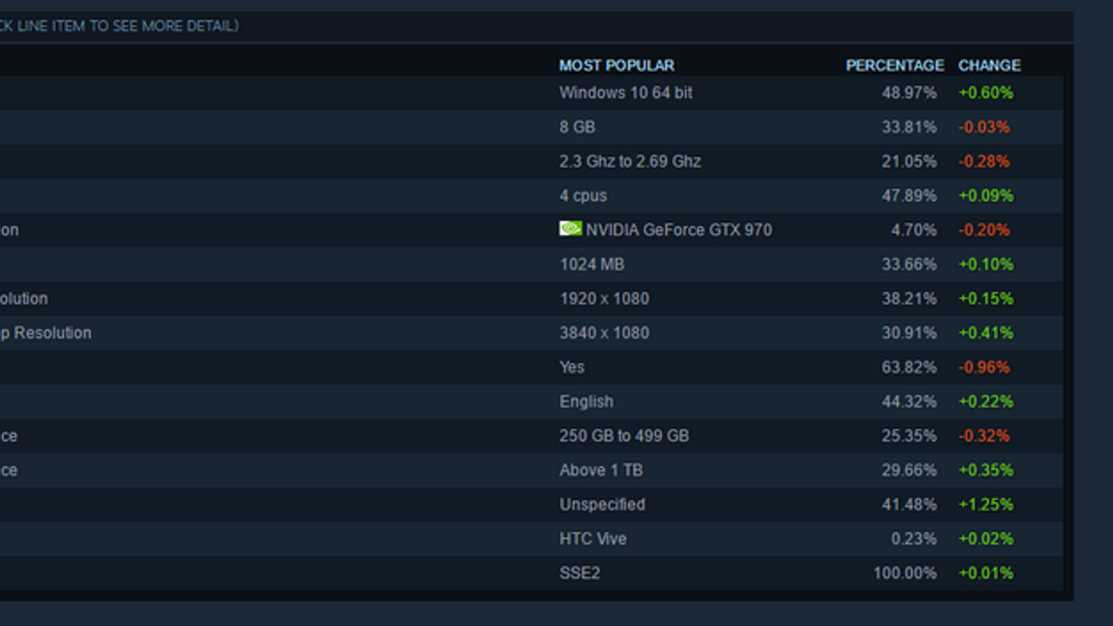 В распределении видеокарт ситуация немного интереснее. Тут хорошо заметен рост популярности адаптеров Nvidia поколения Pascal. Модели GeForce GTX 1060 и GTX 1070 показали наибольший прирост: 0,56% и 0,3% соответственно. Они установлены на 2,09% и 1,89% (в том же порядке) ПК в сервисе Steam. А вот лидеры в лице GTX 970 и GTX 960 потеряли 0,23% и 0,05% соответственно. В целом видеокарты Nvidia установлены у 58,84% пользователей Steam, а модели AMD — у 23,28%. Также интересно узнать, что у 33,66% пользователей установлена видеокарта с 1 ГБ памяти.