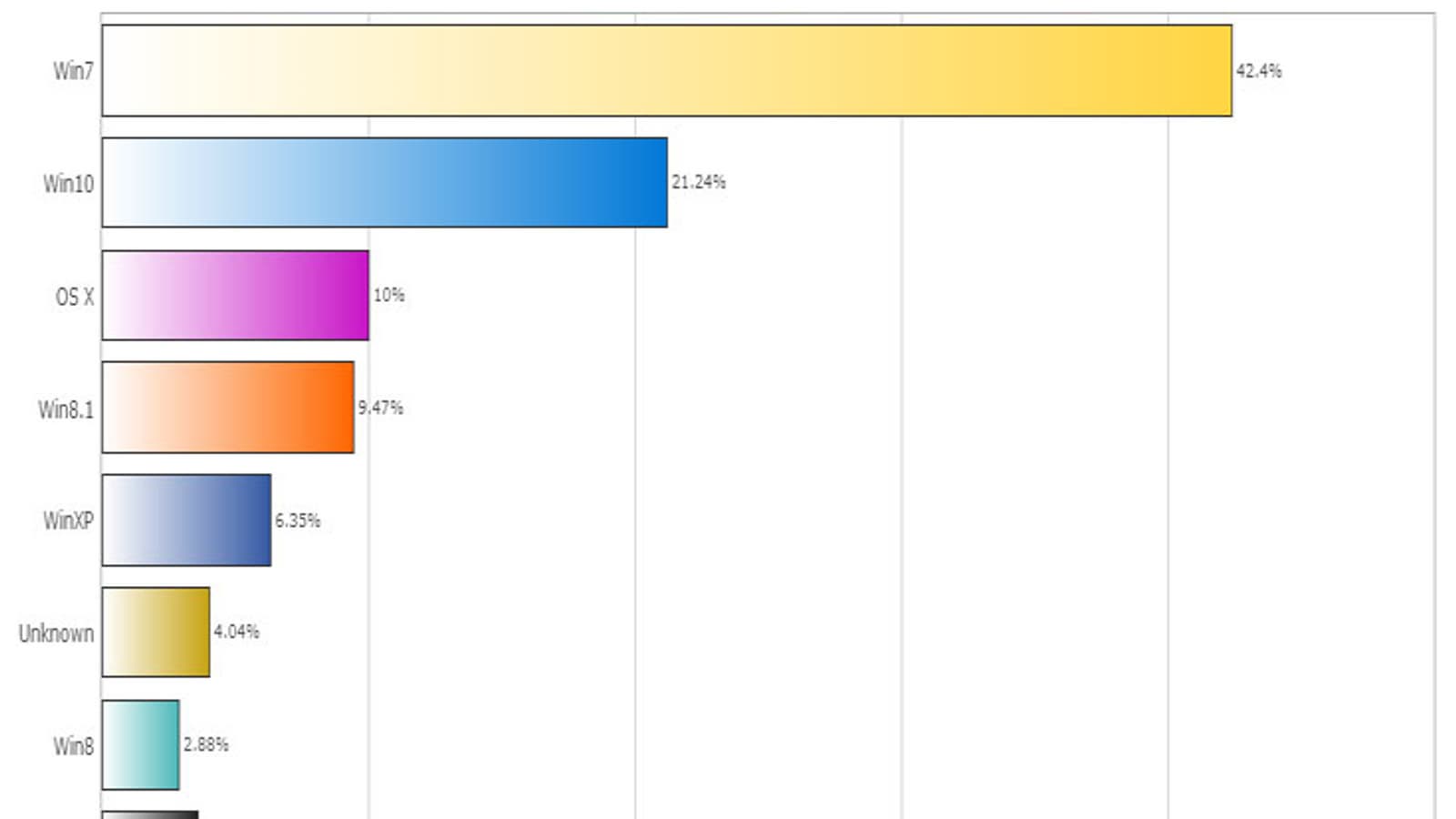 Как видно на диаграмме, лидером продолжает оставаться Windows 7, доля которой превышает 42%. На втором месте находится Windows 10, которая уступает Windows 7 ровно вдвое.