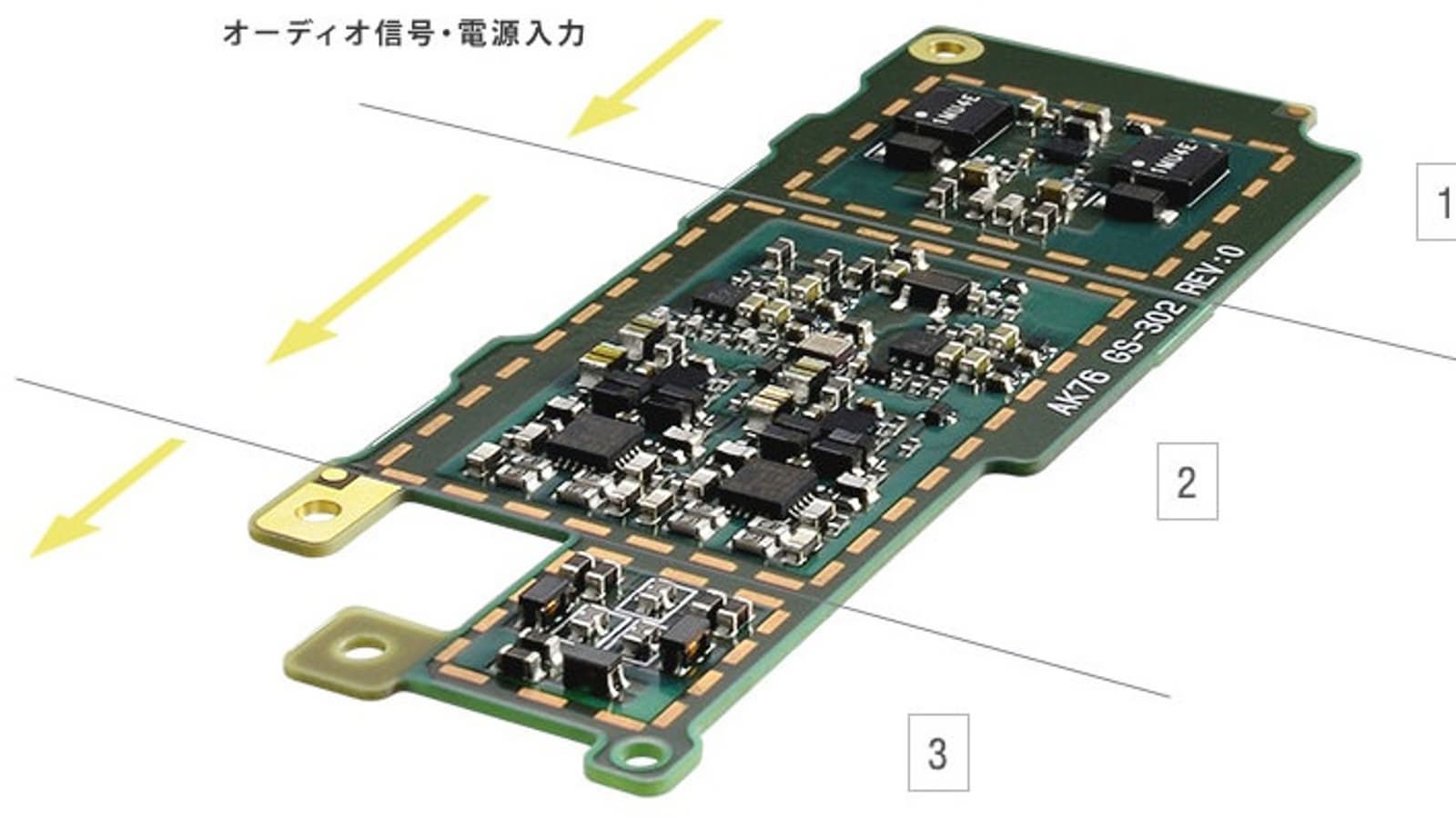 Используются две микросхемы ЦАП ESS Sabre ES9018C2M и два интегрированных наушниковых усилителя Sabre9601K, есть два выхода на наушники: балансный диаметра 2,5 мм и небалансный диаметра 3,5 мм. В первом случае выходная мощность на канал достигает 150 мВт, во втором 75 мВт.