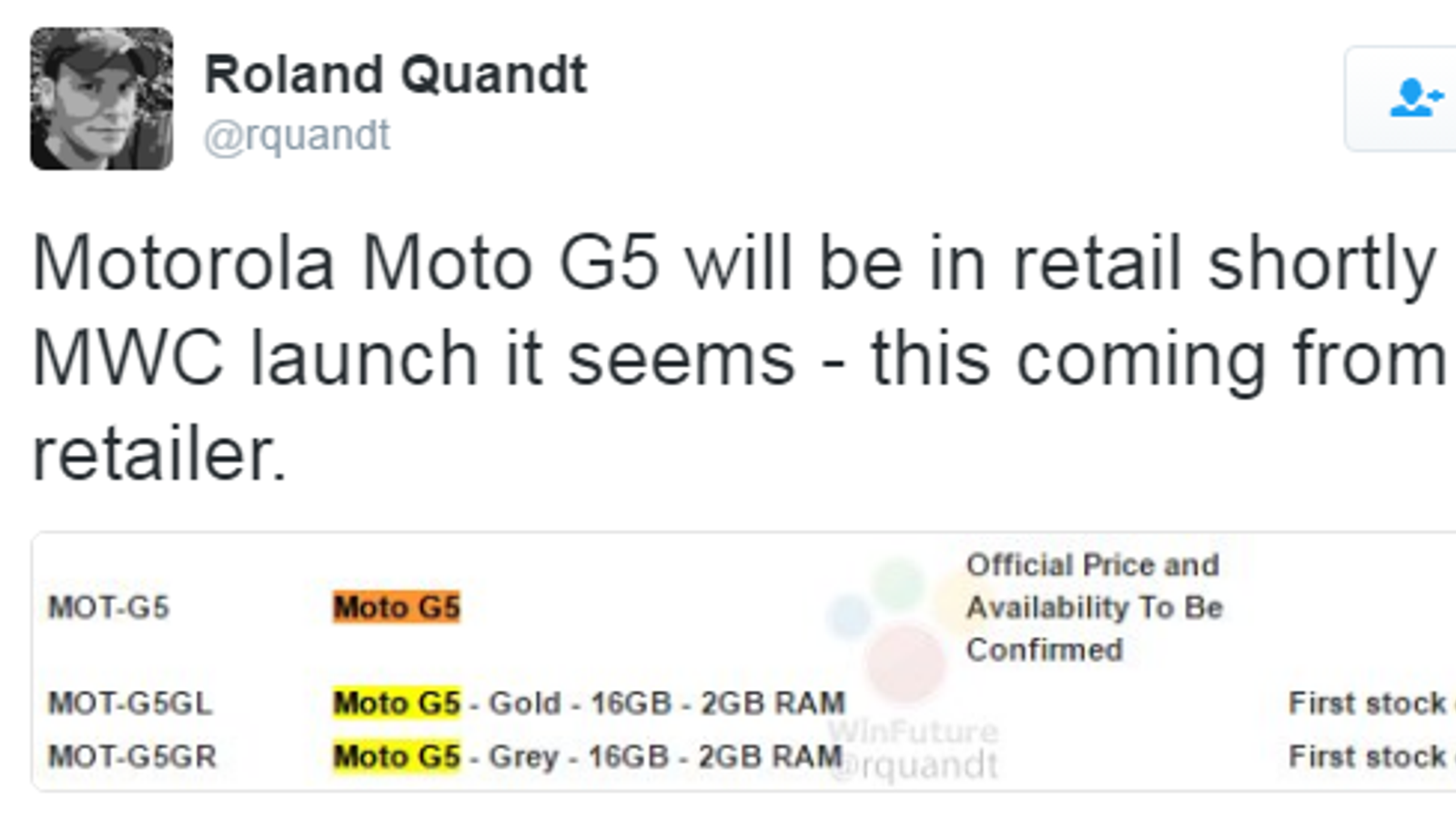 Clove Technology указывает две версии смартфона: в золотом (MOT-G5GL) и сером (MOT-G5GR) вариантах исполнения корпуса. Обе оснащены 2 ГБ оперативной и 16 ГБ флэш-памяти. В качестве даты начала продаж указывается середина марта этого года.