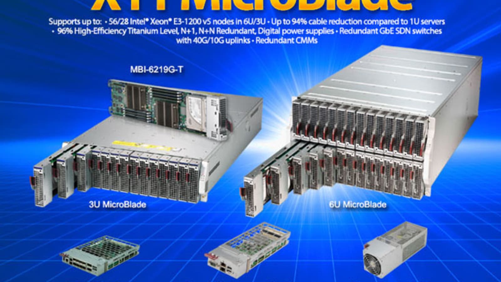 Серверы Supermicro MicroBlade устанавливаются по 14 или 28 в шасси 3U или 6U соответственно. В стойке оказывается скомпоновано 280 процессоров Intel Xeon. Такая компоновка обеспечивает экономию места и снижает требования к системе охлаждения по сравнению с традиционными серверами типоразмера 1U. Особенности архитектуры позволяют независимо модернизировать процессоры, память, средства хранения и ввода-вывода, а также системы питания и охлаждения. Максимально поддерживаемые процессоры — Intel Xeon E5-2600 v4/v3. Шасси может содержать один или два коммутатора, поддерживающих подключения 1GbE, 10GbE и 40 GbE. Для питания используются блоки мощностью 2000 Вт, имеющие сертификат 80Plus Titanium.