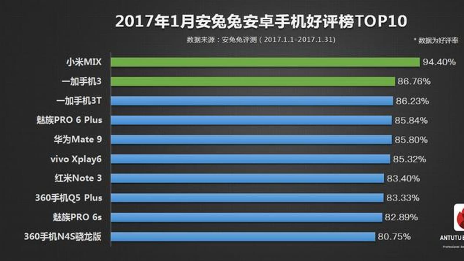 Лидером с большим отрывом стал безрамочный смартфон Xiaomi Mi Mix, рейтинг которого составил 94,4%. Второе место досталось OnePlus 3 с результатом 89,93%, следом идет преемник этого смартфона OnePlus 3T.