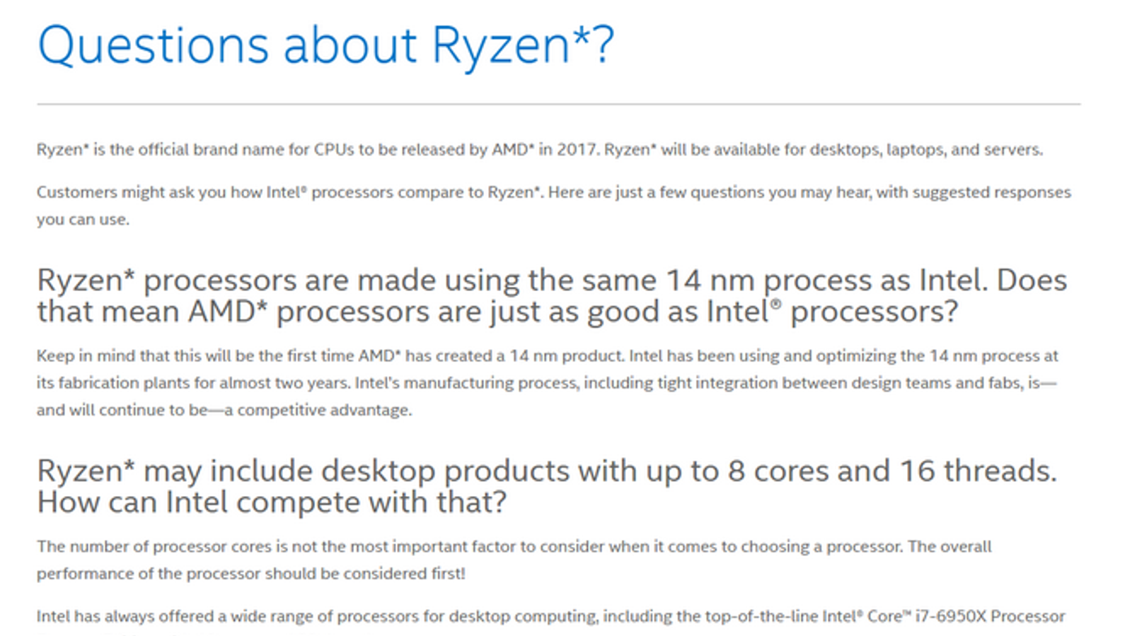 Без полноценных тестов серийных образцов и знания цен сложно сказать, насколько успешно будут конкурировать новинки AMD с процессорами Intel. Но, если верить опубликованному пользователем Reddit изображению, процессорный гигант уже готовит своих представителей к тому, чтобы давать правильные ответы на вопросы, связанные с Ryzen.