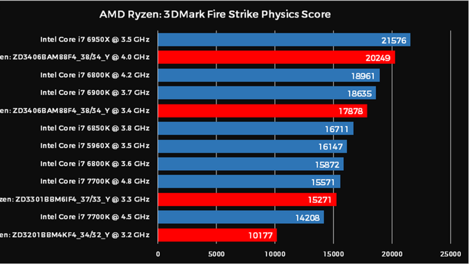 К сожалению, младший CPU не противопоставляется никакому решению Intel, но если заглянуть в базу Futuremark, можно увидеть, что прямым конкурентом одному из младших CPU Ryzen в этом тесте будет Core i7-6700. Также видно, что Intel Core i7-7700K на частоте 4,2 ГГц опережает «соперника» на 40%. Зато шестиядерная модель AMD оказывается быстрее флагмана Intel и совсем незначительно отстаёт от него же, но с частотой 4,8 ГГц. Судя по параметрам, речь о модели Ryzen 5 1600X, которая, если верить слухам, будет стоить 260 долларов.