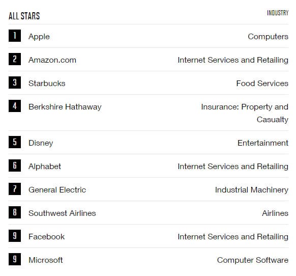 Вот уже десять лет подряд этот список возглавляет компания Apple, следом за ней идут Amazon, Starbucks, Berkshire Hathaway и Disney.
