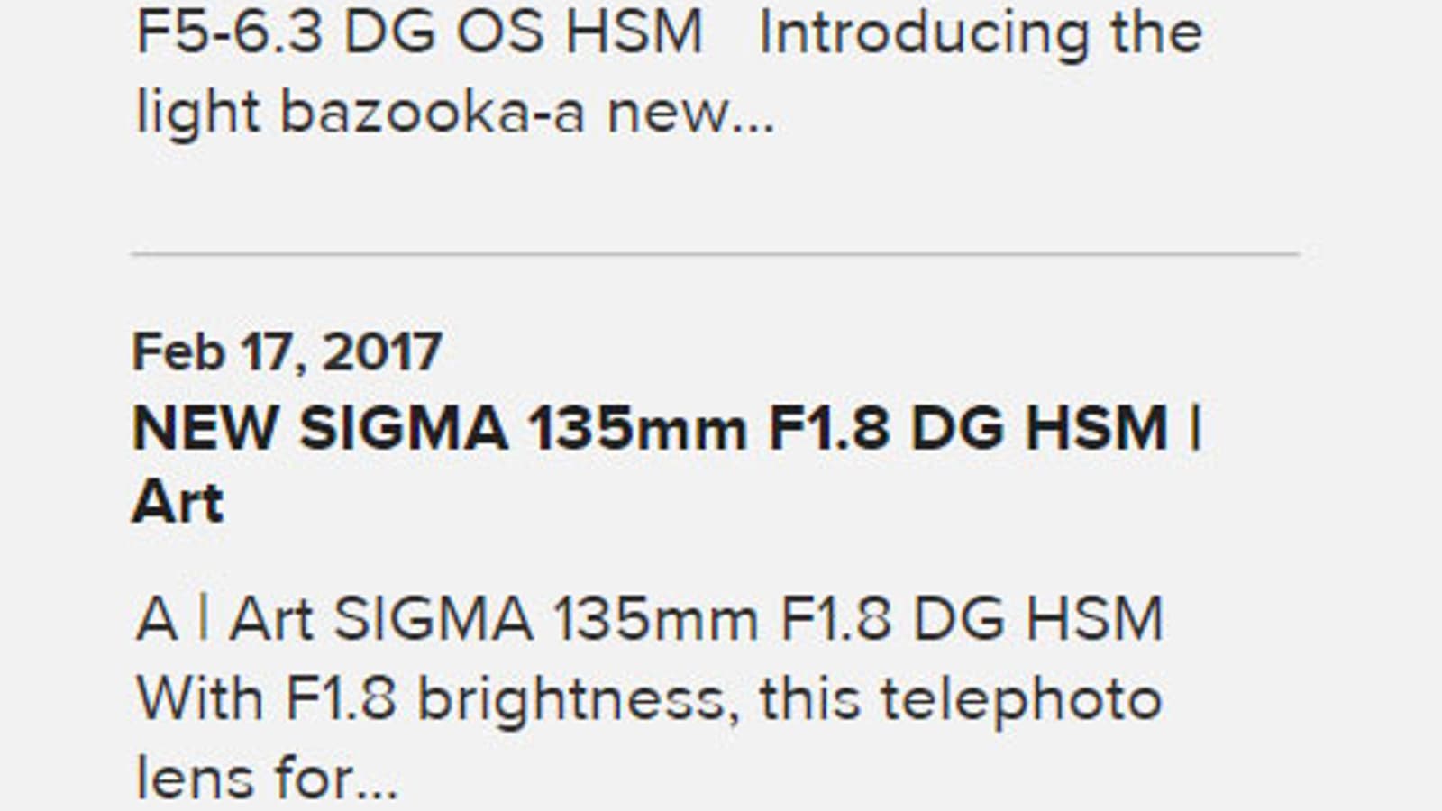 Как мы уже сообщали, на выставке CP+ ожидается анонс объективов Sigma 135mm f/1.8 Art, 24-70mm f/2.8 Art и 14mm f/1.8 Art. На днях производитель подтвердил эти сведения, добавив заголовки соответствующих пресс-релизов на главную страницу своего сайта. Пока, правда, они ведут все на ту же главную страницу, однако сами заголовки не оставляют сомнений в намерениях компании.