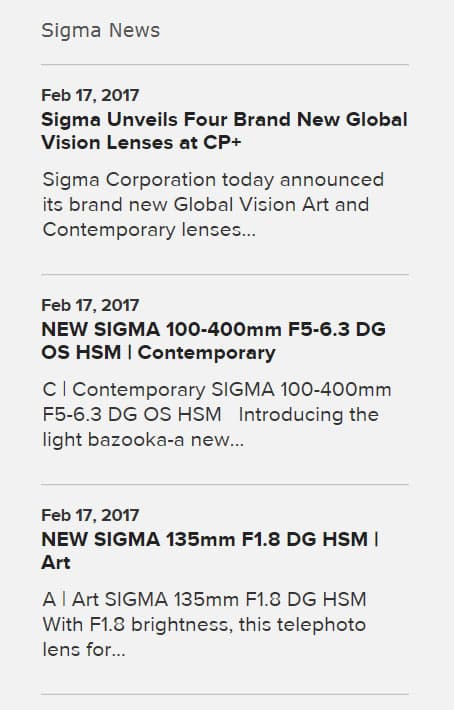 Как мы уже сообщали, на выставке CP+ ожидается анонс объективов Sigma 135mm f/1.8 Art, 24-70mm f/2.8 Art и 14mm f/1.8 Art. На днях производитель подтвердил эти сведения, добавив заголовки соответствующих пресс-релизов на главную страницу своего сайта. Пока, правда, они ведут все на ту же главную страницу, однако сами заголовки не оставляют сомнений в намерениях компании.