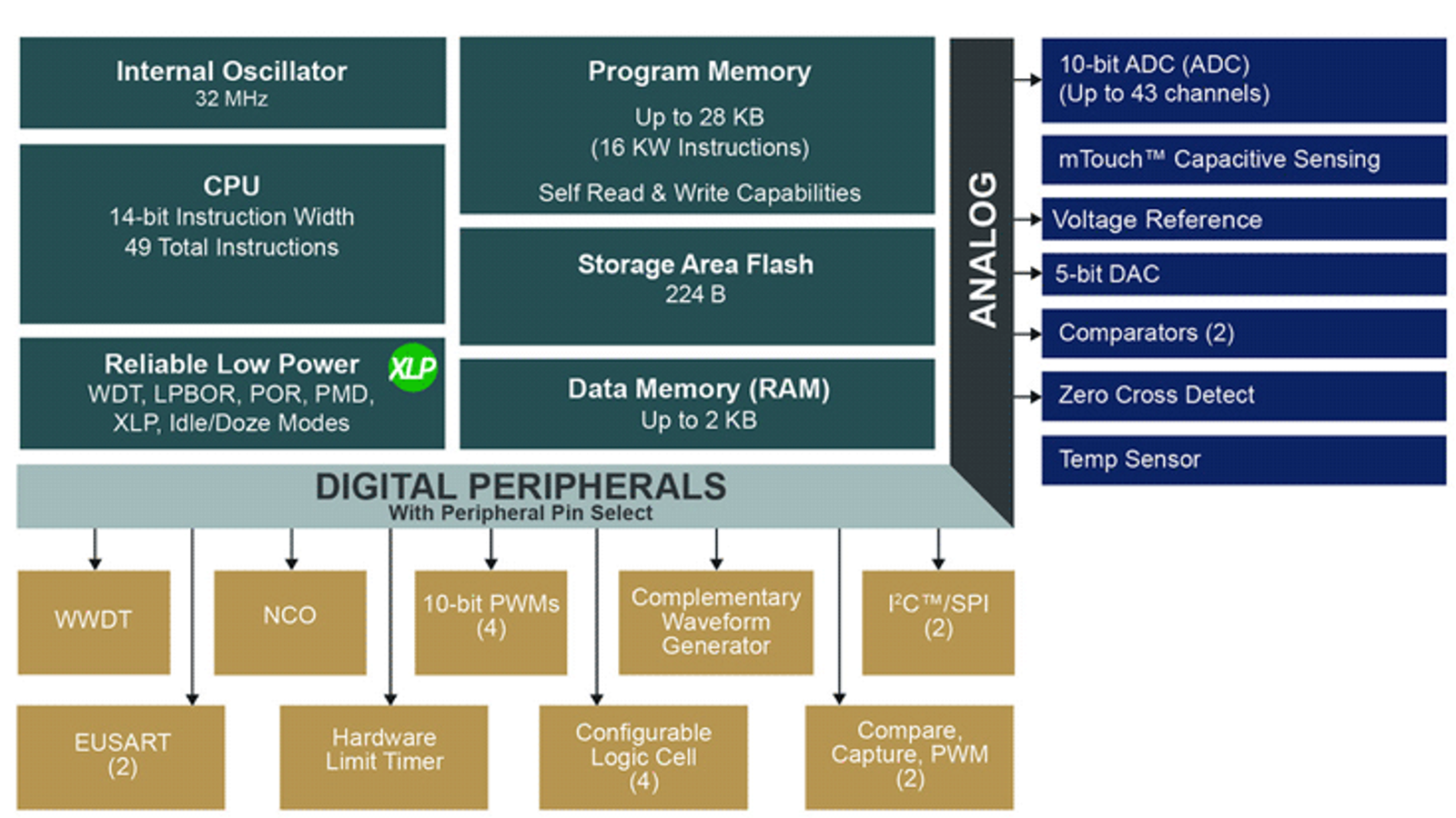 Компания Microchip Technology представила семейство восьмиразрядных микроконтроллеров PIC с периферийными блоками, доступными независимо от ядра (Core-Independent Peripherals, CIPs). К общим чертам моделей семейства также относится наличие встроенного генератора частоты 32 МГц и механизм защиты загрузочного раздела памяти для предотвращения ошибочной перезаписи. Кроме того, есть защищенный участок памяти Device Information Area (DIA) для хранения уникального идентификатора устройства и калибровочных констант. Новые микроконтроллеры поддерживаются средой разработки Microchip MPLAB Xpress with MPLAB Code Configurator (MCC).