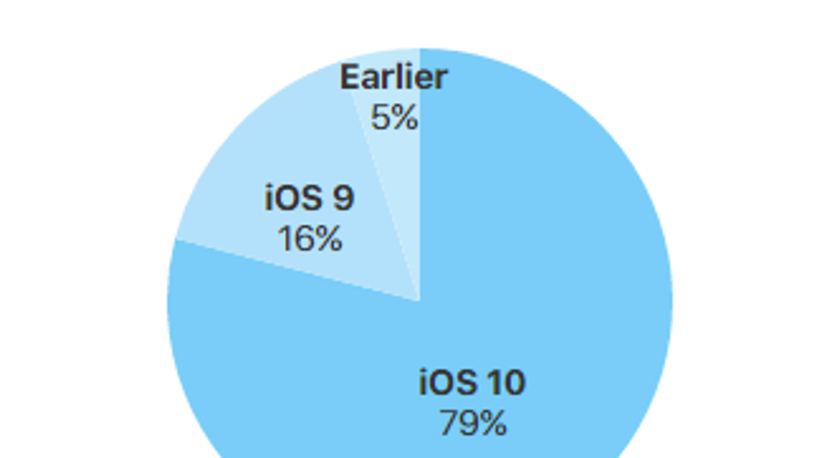 Компания Apple сообщила, что на данный момент операционная система iOS 10 установлена на 79% совместимых устройств. Для этого ей понадобилось чуть более пяти месяцев. Ещё 16% приходится на iOS 9, а оставшиеся 5% — ещё более старые версии.