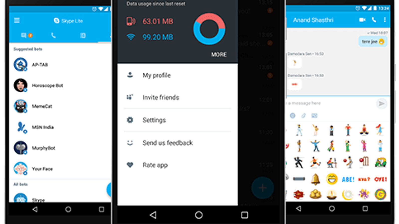 По этой же причине компания Microsoft выпустила ПО Skype Lite для ОС Android. Microsoft отмечает, что приложение было создано в Индии для пользователей Индии. Основная особенность этой версии в том, что она сильно пережимает изображения и видео, экономя трафик и нервы пользователей.