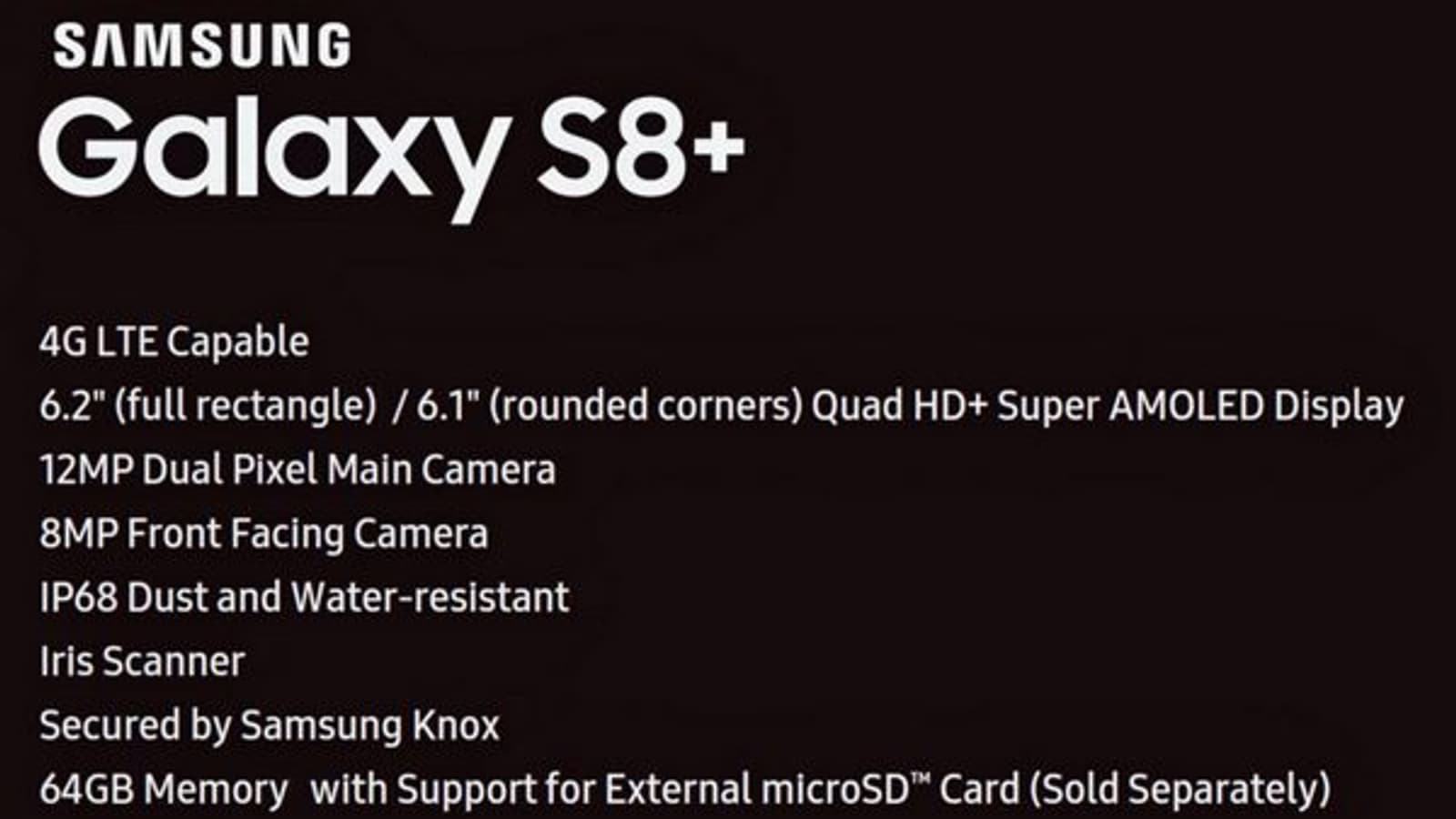 Инсайдер Эван Блэсс (Evan Blass) опубликовал изображение из официальной презентации смартфона Samsung Galaxy S8, на котором перечисляются характеристики старшей версии устройства под названием Samsung Galaxy S8+.