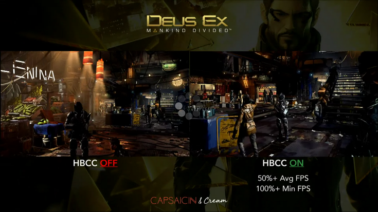 Для начала компания ещё раз напомнила о новом контроллере высокопроизводительной кэш-памяти — High-Bandwidth Cache Controller (HBCC). Вместо того, чтобы мучить присутствующих подробностями о работе этого решения, AMD показала его в действии. Так, в игре Deus Ex: Mankind Divided при активации HBCC средняя частота кадров увеличивалась на 50%, а минимальная — вдвое. Но как AMD реализовала это сравнение, не объяснили.