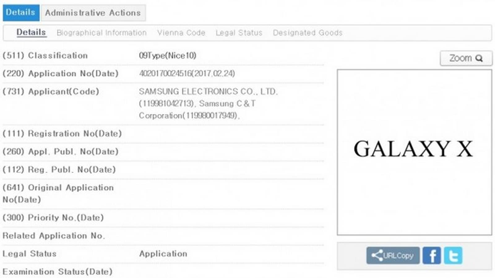Подтверждением выхода Samsung Galaxy X в этом году стала регистрация соответствующей торговой марки. Сначала источники сообщили о появлении бренда Galaxy X в корейской базе данных Korea Intellectual Property Rights Information Service. Затем торговая марка Galaxy X также была зарегистрирована в United States Patent and Trademark Office для использования на территории США.