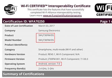 Смартфон Samsung Galaxy J7 (2017) прошел сертификацию в организации WiFi Alliance