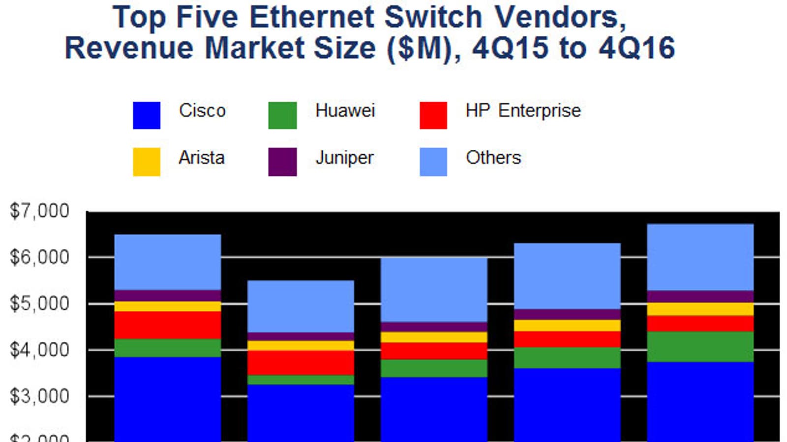 Лидером рынка коммутаторов Ethernet осталась компания Cisco, но ее доля за год сократилась с 59,1% до 55,6%. Доля занимающей второе место компании Huawei составляет 7,0%. На третьем месте находится HPE с долей 5,0%. В первую пятерку также входят компании Arista Networks и Juniper.