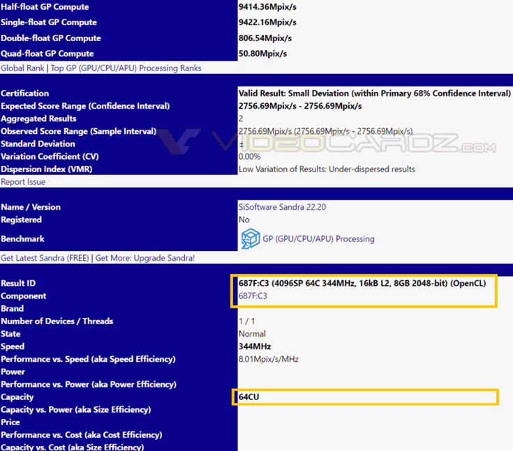 Судя по опубликованным данным, GPU с идентификатором 687F:C3 имеет 8 ГБ памяти, подключенной к 2048-разрядной шине. Речь идет о двух стеках HBM2 по 4 ГБ, каждый из которых имеет 1024-разрядную шину. Количество вычислительных блоков, равное 64, соответствует 4096 потоковым процессорам. Значение частоты — 344 МГц — явно определено программой ошибочно.
