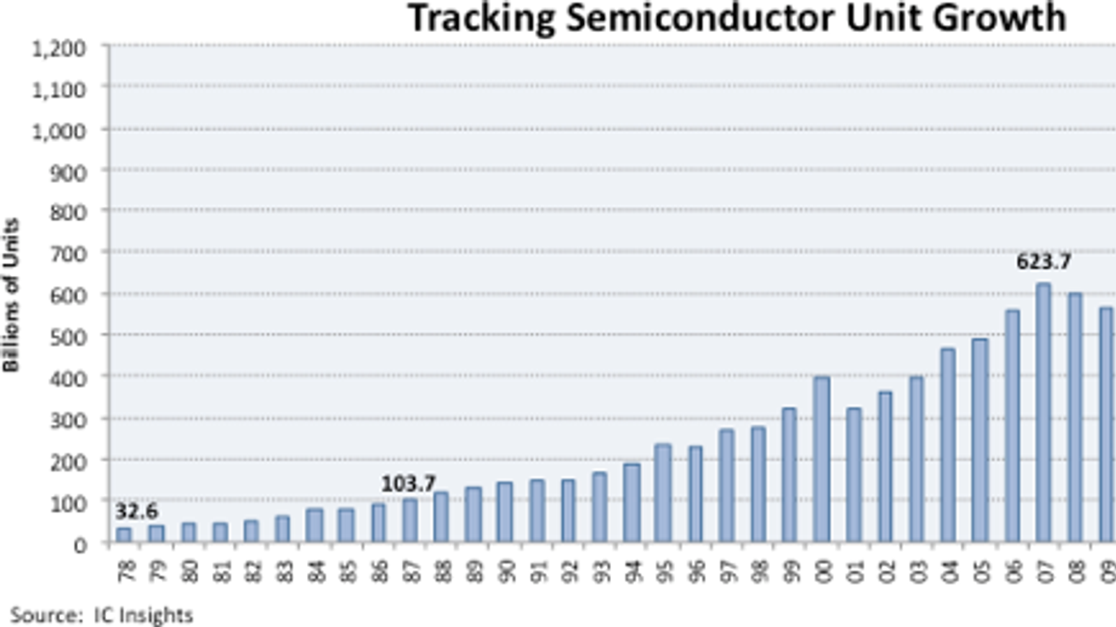 Специалисты аналитической компании IC Insights снова попробовали заглянуть в будущее рынка полупроводниковых изделий. Они подтвердили прошлогодний прогноз, согласно которому, в 2018 году впервые будет отгружено более 1 трлн полупроводниковых изделий. Аналитики ожидают, что рынок будет расти, по крайней мере, в течение ближайших пяти лет.