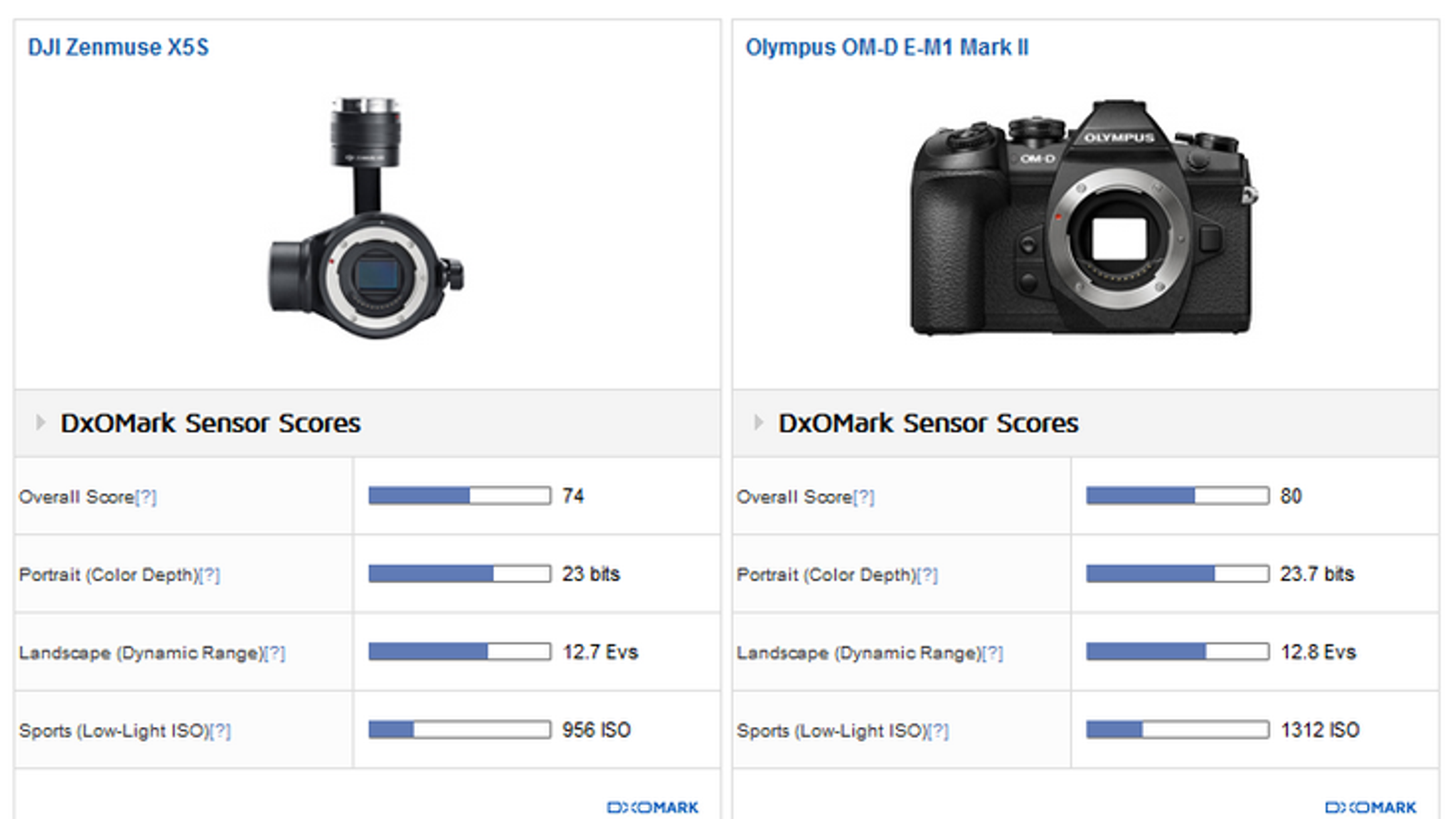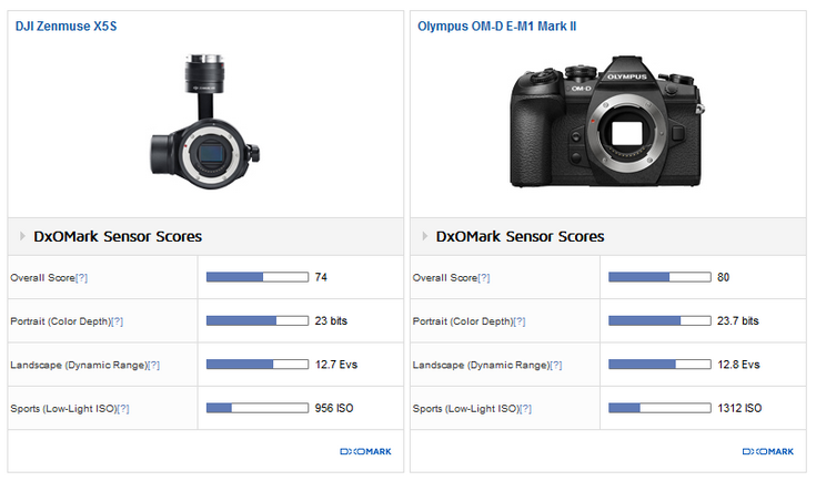 К примеру, дрон Yuneec Breeze содержит 12-мегапиксельную камеру с модулем CMOS оптического формата 1/3,06 дюйма, как у многих смартфонов. Его показатели специалисты сравнивают с датчиком в смартфоне Nokia Lumia 1520. При этом камера DJI Zenmuse X5S, предназначенная для дронов этого производителя, основана на 21-мегапиксельном датчике формата Micro Four Thirds, что уже сравнимо с камерой Olympus PEN-F. К слову, именно Zenmuse X5S оказалась лучшей в первом тесте DxOMark, заработав 74 балла из 100. Камера Yuneec Breeze заработала 34 балла.