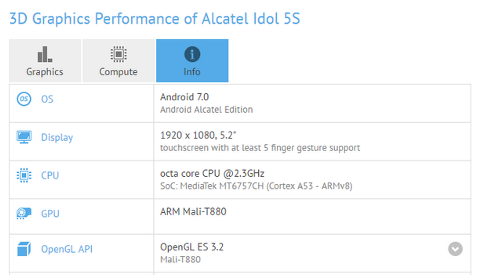 Смартфон Alcatel Idol 5S появился в базе данных GFXBench, что позволяет нам узнать его параметры.
