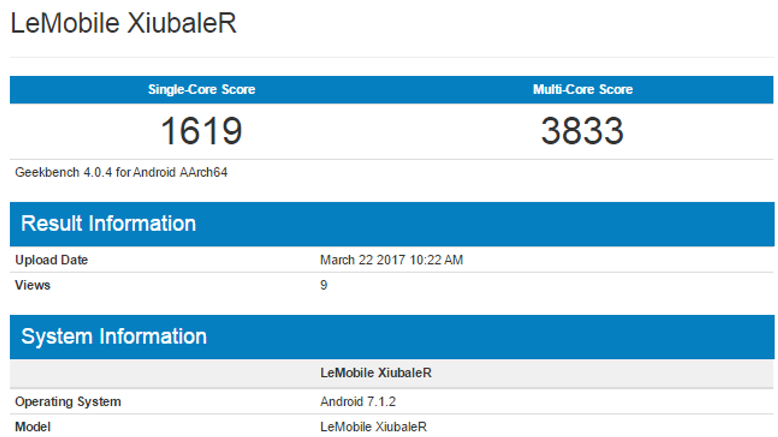 В базе данных тестового пакета Geekbench появился неизвестный смартфон компании LeEco под кодовым названием XiubalerR.